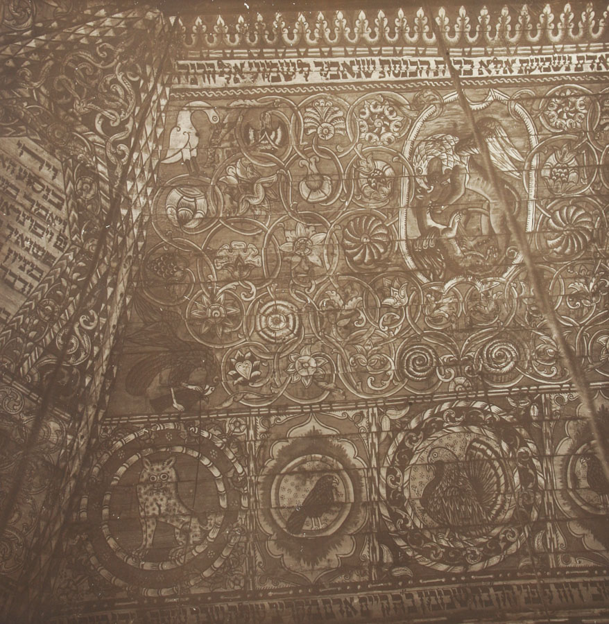 The newly renovated ceiling was a towering tent-like wooden cupola, inspired by the Tent of the Tabernacle, with a curving, undulating surface in a Baroque style. This wooden cupola was probably the first of its kind to be built in the region. The interior of the ceiling was completely covered by elaborate and brightly colored paintings showing Hebrew inscriptions and vibrant animal figures set against dense, vegetative backgrounds. When compared to the drab daily color palette experienced by most of the town's Jewish community, the experience of entering the intensely colored interior of one of the painted synagogues must have been exhilarating. If we could enter the Gwozdziec synagogue today, we would step into a prayer hall covered with a vibrant tapestry of wall paintings. Looking upward, the ceiling ascends in rich bordered tiers toward a steeply sloping pyramidal top.