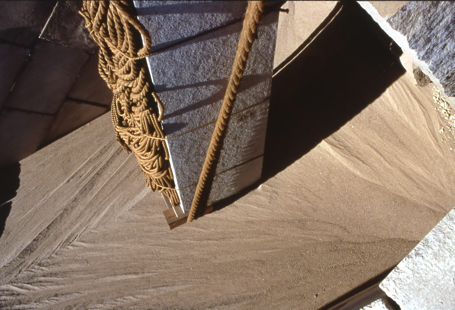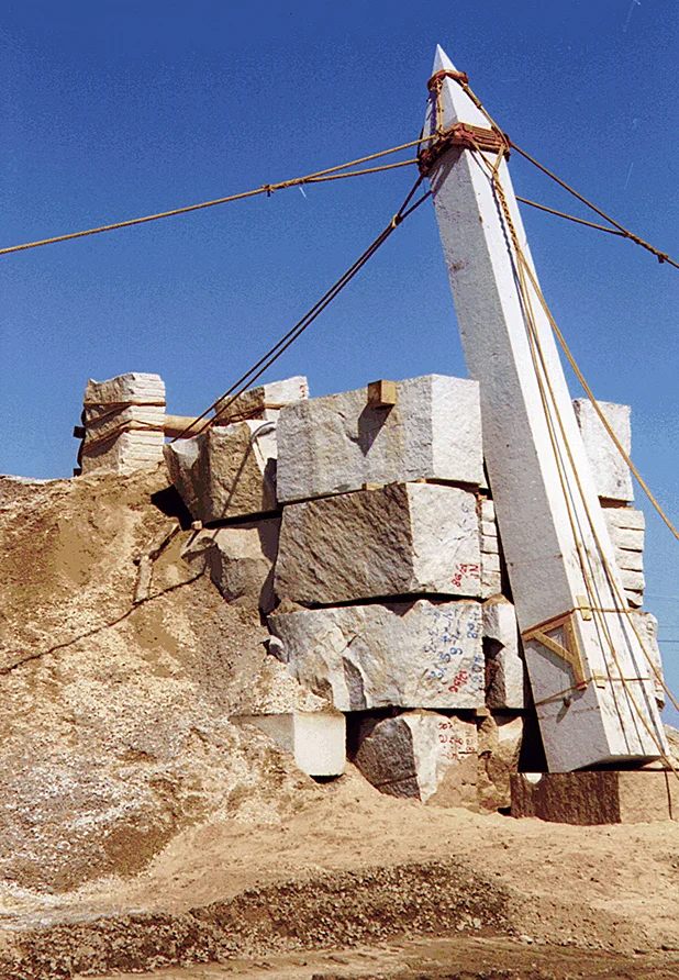 The plan, based on Roger Hopkins's original idea demonstrated on a smaller scale in Egypt, was to haul the huge obelisk, on its side, up a gravel ramp to the edge of a sand-filled pit lined with stone blocks. As the sand was removed from two doors at each side of the pit, slowly and painfully by human diggers and carriers of the sand, the base of the obelisk slowly lowered into a turning groove, to a 75 degree angle, where it could be then pulled by ropes into an upright position. Extensive ropes and rigging master-minded by Jim Kricker and Grigg Mullen allowed all of this to happen in a controlled and careful manner.
